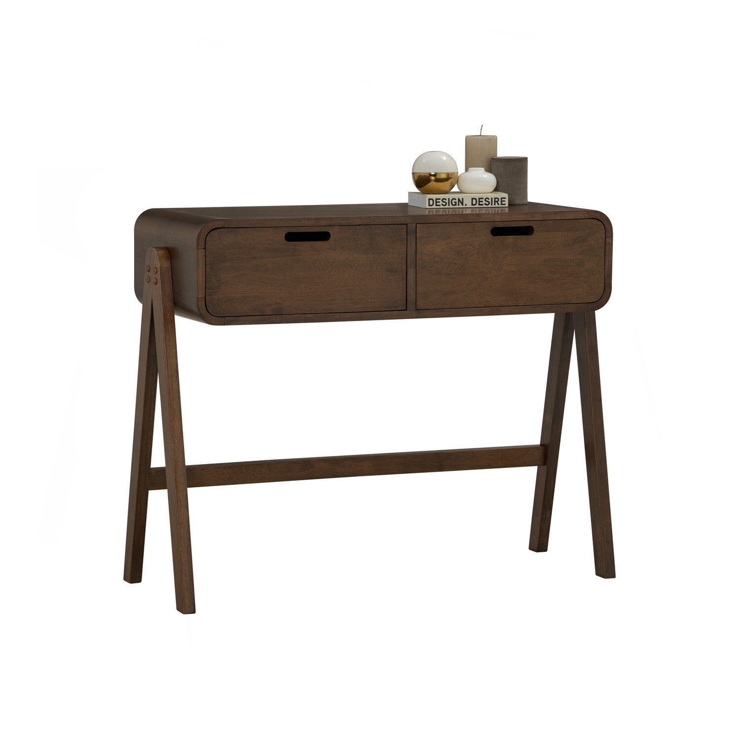 The ANGUS Console Table in Cocoa showcases solid wood construction throughout, combining a robust top with sturdy legs for reliable support. Two spacious drawers provide discreet storage for entryway accessories, mail, or decorative items while maintaining a clean silhouette. The rich cocoa finish adds warmth and sophistication to hallways, living rooms, or home offices.