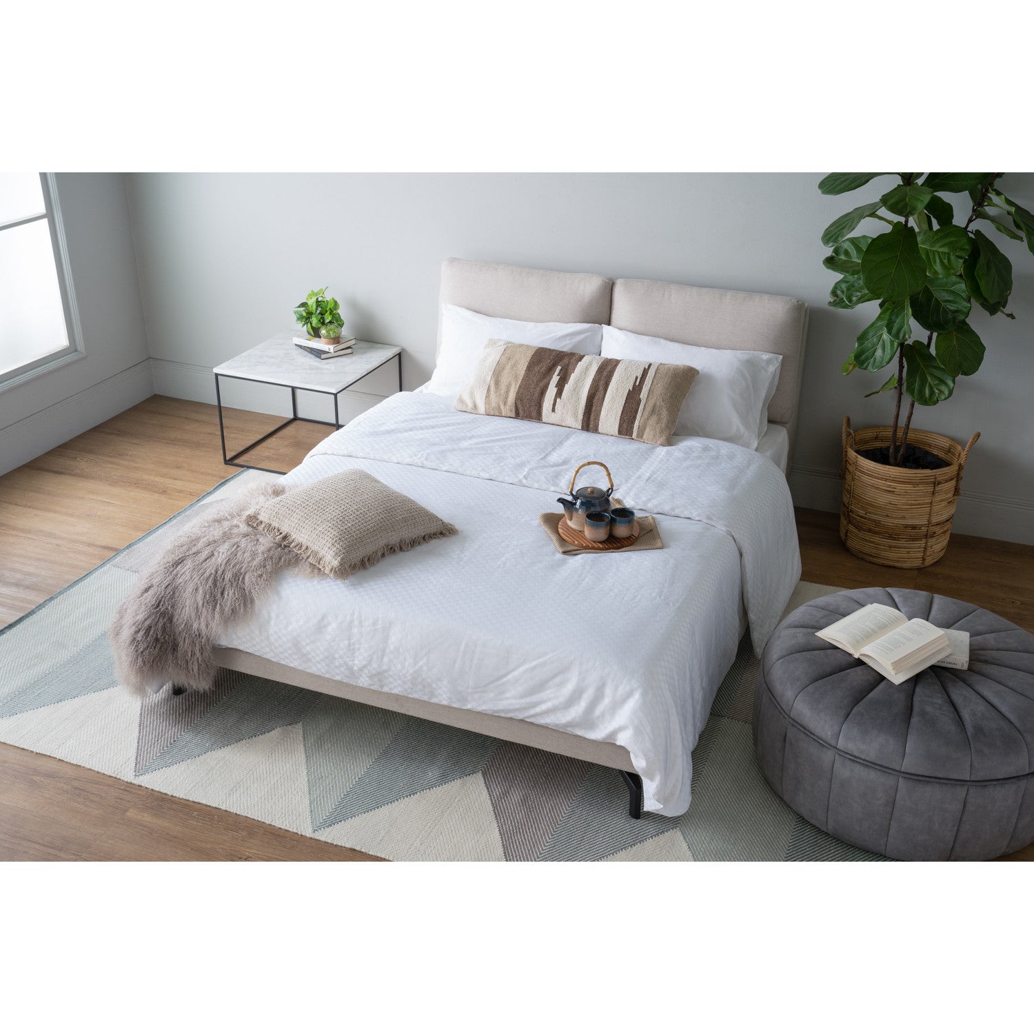 The BLANDUS Bedframe (Queen Size) supported by sleek black epoxy-coated metal legs, it delivers strength while maintaining a clean profile. The bed frame is upholstered in Oat White Gulix fabric, bringing a light, airy quality that brightens the room.