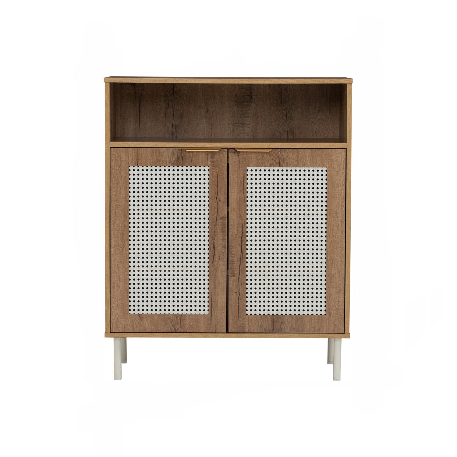 The DALLAS Multi Function Cabinet built with a matte white metal frame and laminated oak body, it pairs brightness with natural warmth. Its slim and compact profile makes it suitable for living rooms, bedrooms, or offices, providing practical storage without overwhelming the space.