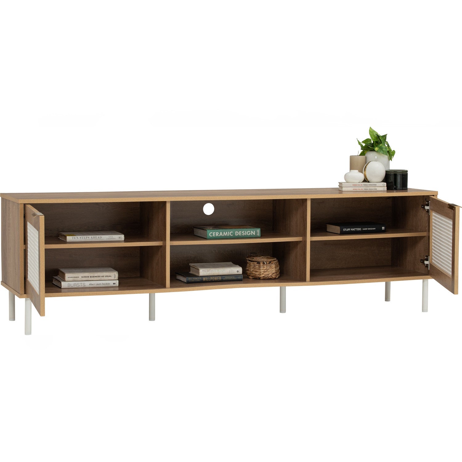 The DALLAS TV Cabinet supported by matte white metal legs, its oak laminated body highlights natural grain and warmth. Compact yet spacious, it offers practical storage with a fresh aesthetic. Perfect for bright and airy living spaces, it blends seamlessly with minimalist interiors. A best-value cabinet that combines style, durability, and function.