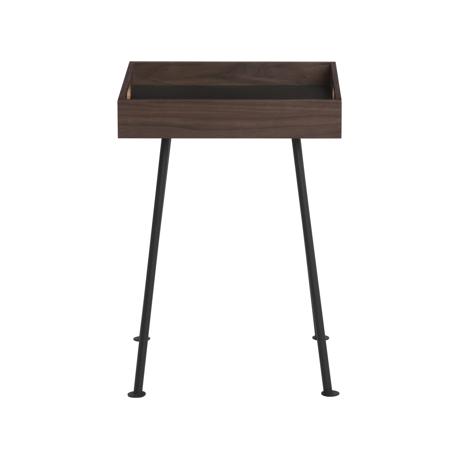The GABLE Side Table constructed with a durable metal base and a walnut veneer top, it highlights natural warmth while maintaining a sleek form. Its compact size and practical proportions make it suitable for apartments, studios, or larger living areas as a complementary accent.