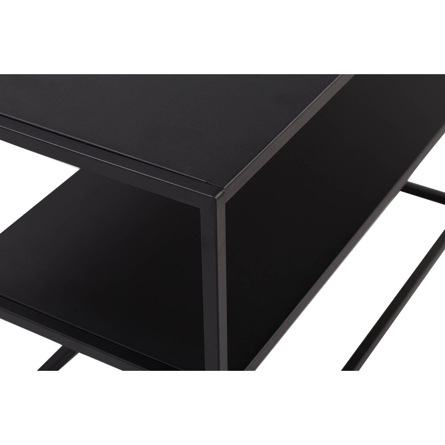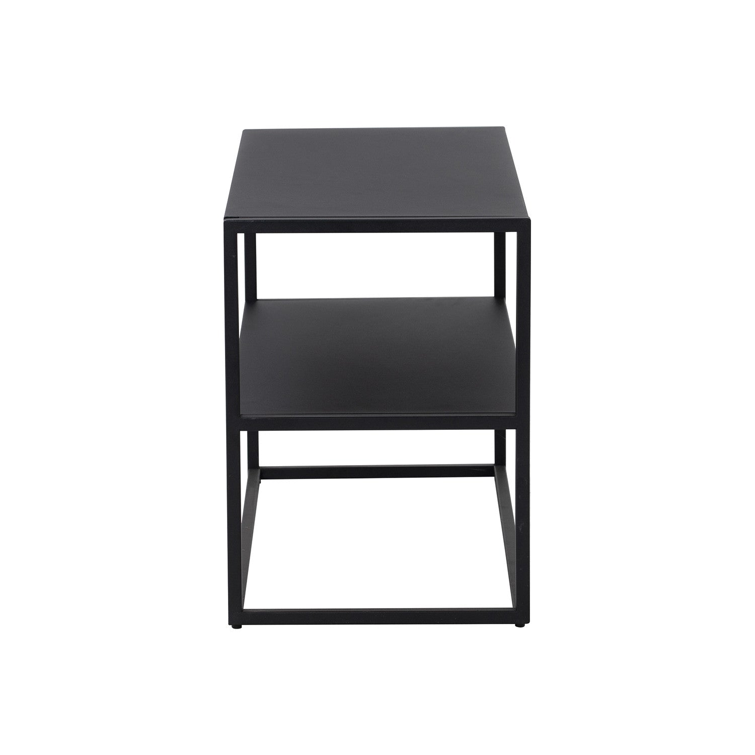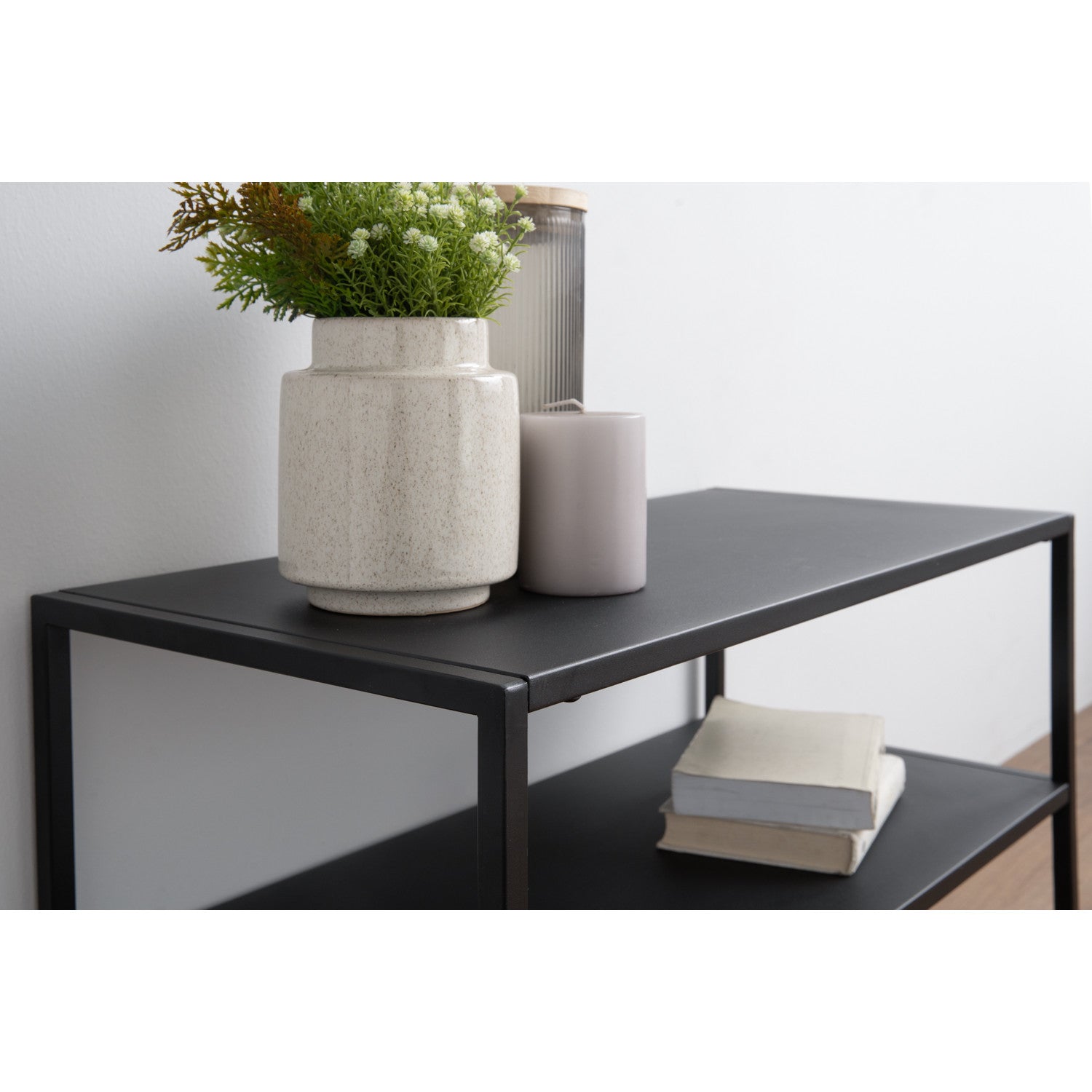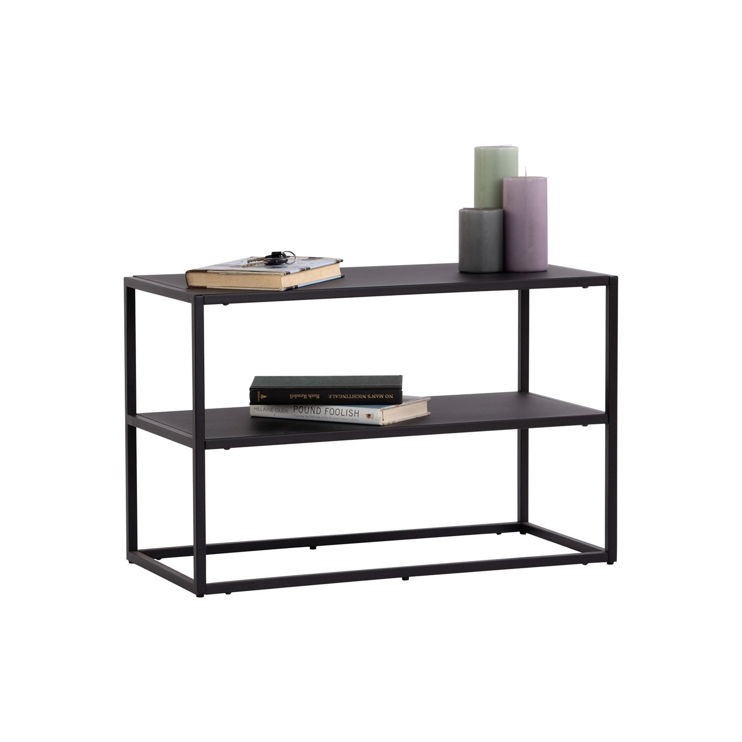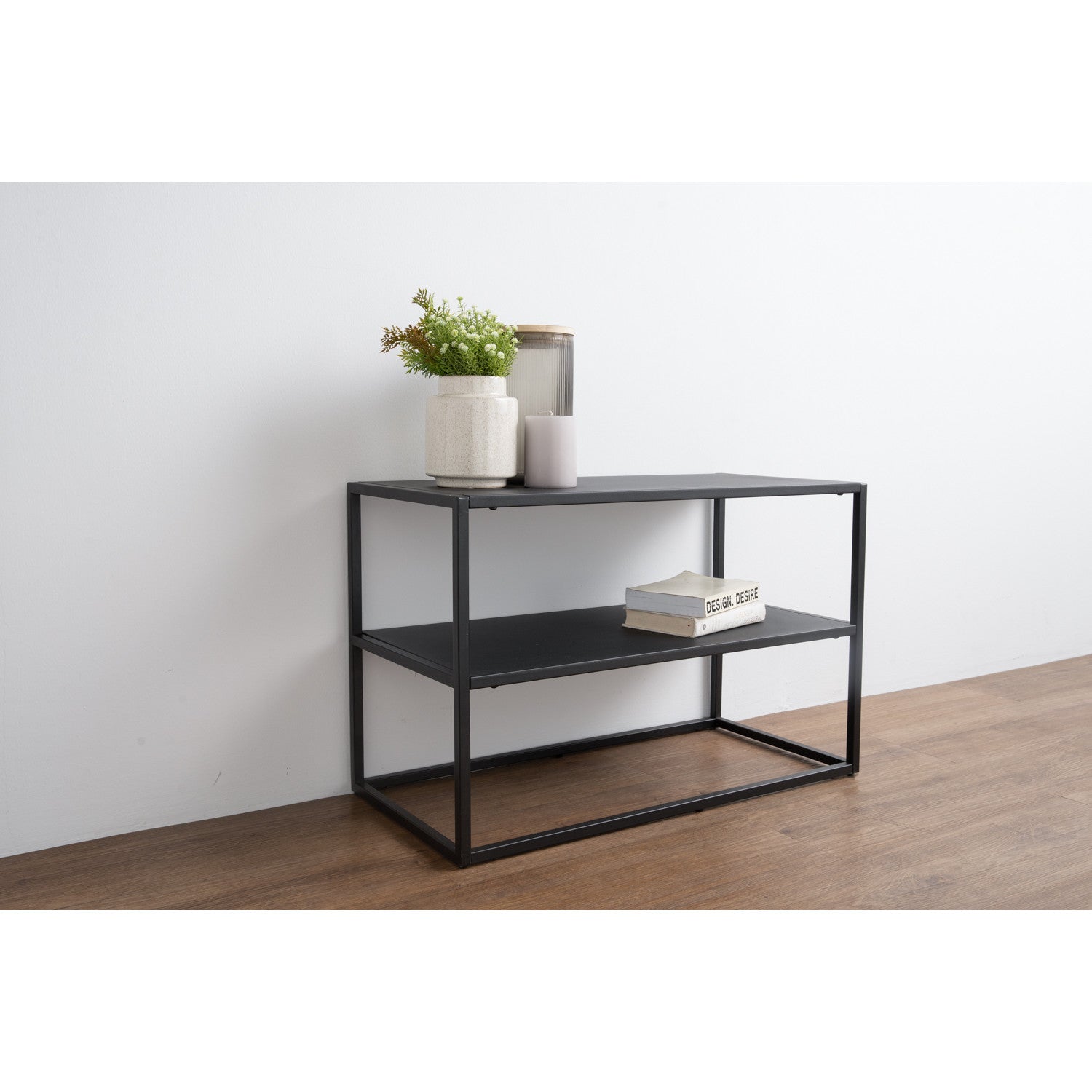 The KATHERYN Shoe Rack offers a minimalist industrial design with a sturdy steel frame finished in matte black epoxy. Its compact two-shelf structure provides practical storage for everyday footwear while maintaining a clean, open look. Ideal for entryways or small living spaces.