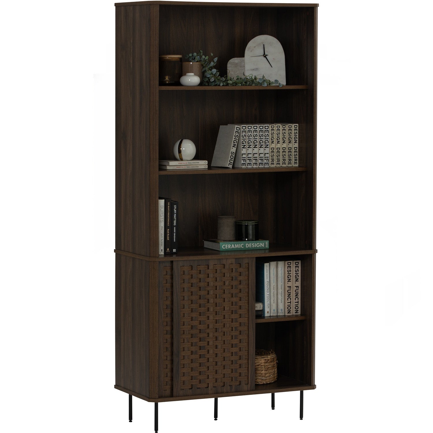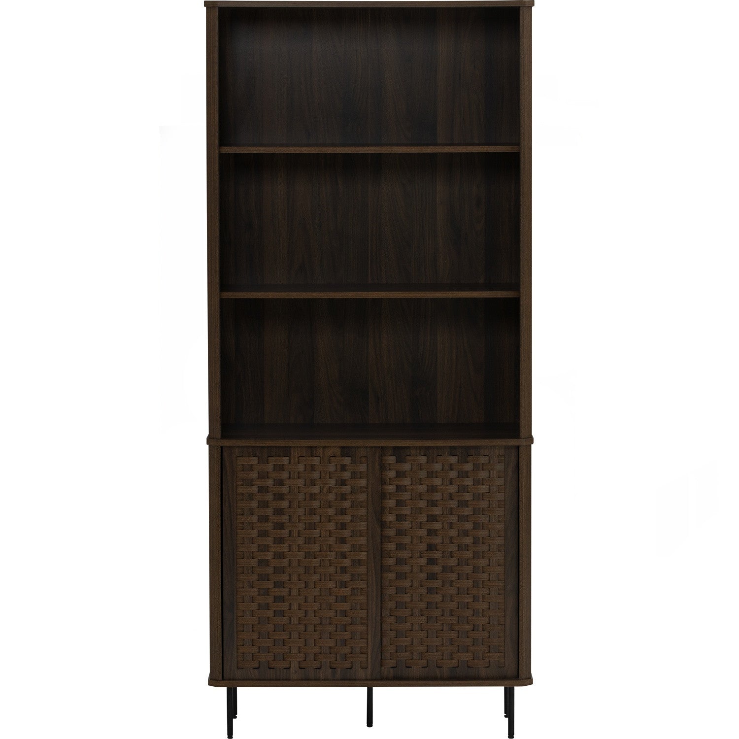 The KRABI Bookcase features a walnut-toned laminated board body supported by sleek black metal legs, creating a striking two-tone aesthetic. Open shelving and door storage provide flexible display and concealment options for books, décor, and everyday items. It fits comfortably in living rooms, bedrooms, or home offices without overwhelming the space. Built with durable laminated board construction and sturdy metal framework.