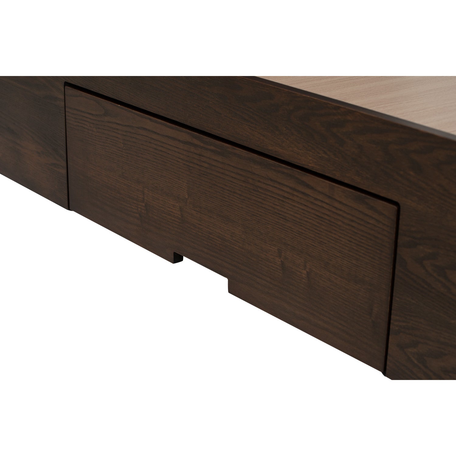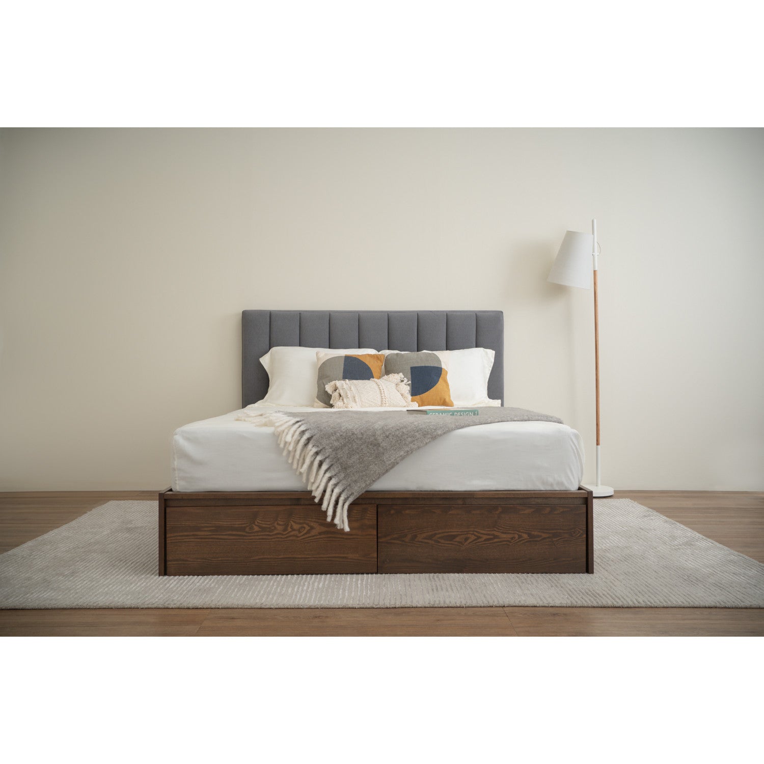 The MOLA Bedframe With Storage (Queen Size) crafted from MDF and veneer, enhances functionality while maintaining elegance. The headboard is upholstered in dark grey fabric, offering durability and pet-friendly practicality. Cocoa tones in the base add warmth and timeless appeal to the design.