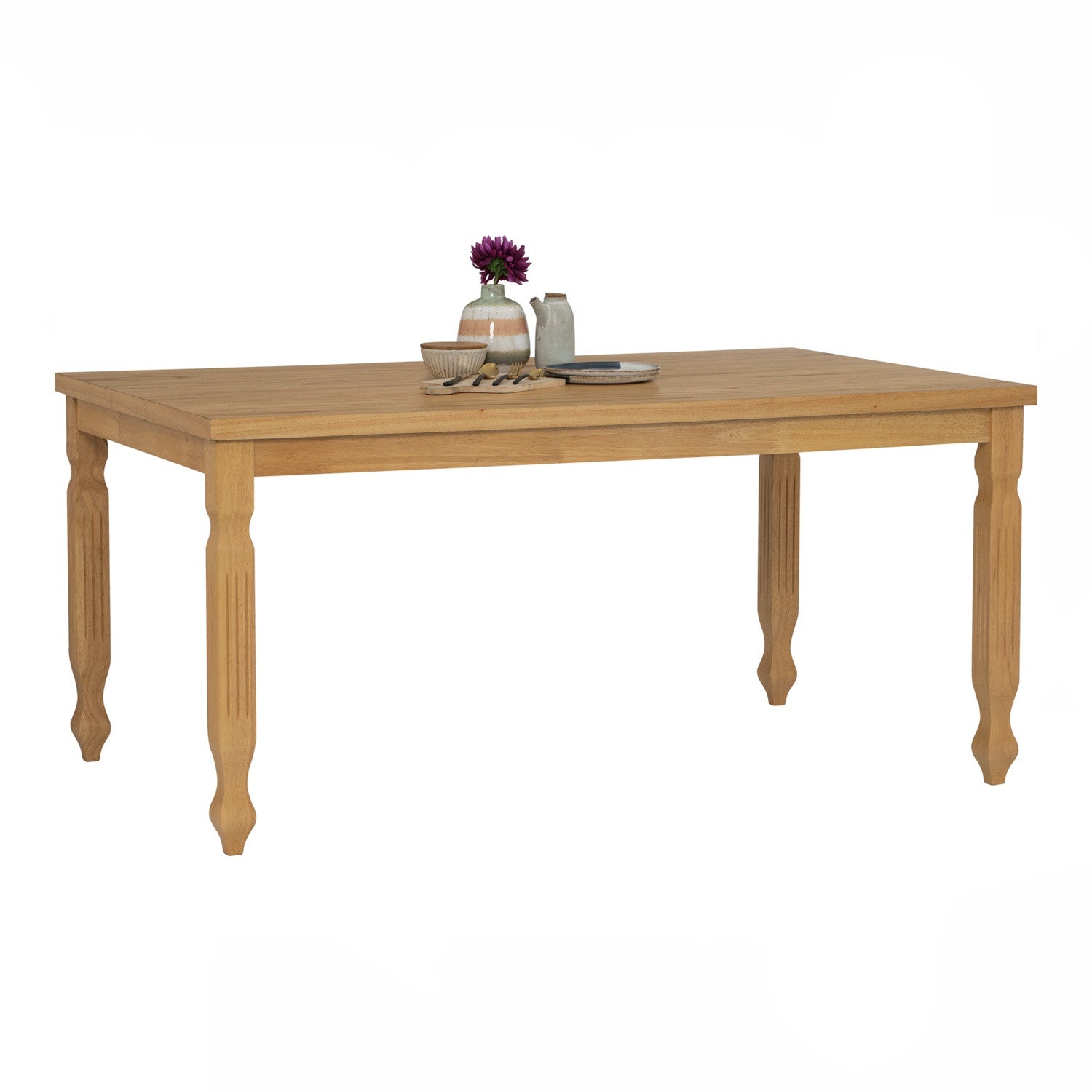 The TREVON Dining Table combines sturdy solid wood legs with a durable MDF and veneer top in a warm natural finish. The solid wood construction ensures stability and longevity, while the veneer top resists daily wear and maintains its elegant appearance. Perfect for modern dining spaces that demand both style and practicality.